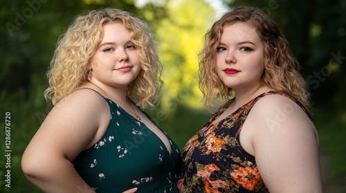 Obraz premium Two women in summer dresses, soft light, vibrant backdrop, radiating warmth...