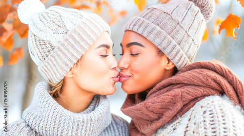 © Elena, Obraz premium Two women sharing a kiss in cozy winter sweaters surrounded by autumn leaves