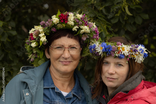 © Emvats, Obraz premium Two women stand close together wearing colorful floral wreaths made of wildflowers and greenery, smiling gently against a leafy natural backdrop.