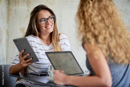 Fototapeta premium Two women using technologies and drinking coffee while sitting in cafe.