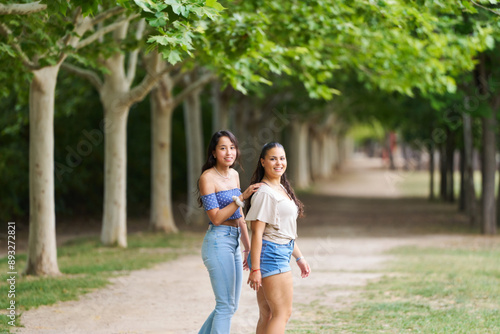 © Retamosa, Fototapeta premium Two women walking in a park with trees in the background