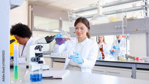 © PeopleVideos, Obraz premium Two women working at the lab on the microscopes