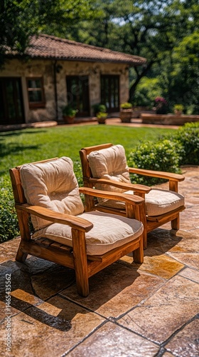 Fototapeta premium Two wooden chairs on tiled terrace with blurred house