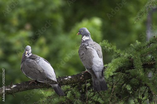 © birgitte, Fototapeta premium Two woodpigeons sitting on a Branch