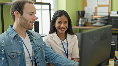 Fototapeta premium Two workers man and woman sitting on table using computer speaking at the office