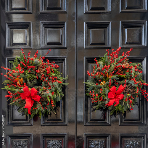 © elenarostunova, Fototapeta premium Two wreaths made of fir or spruce branches with red bows and red berries.