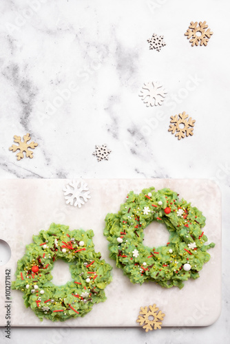 © azurita, Fototapeta premium Two wreaths made of green food are on a white cutting board