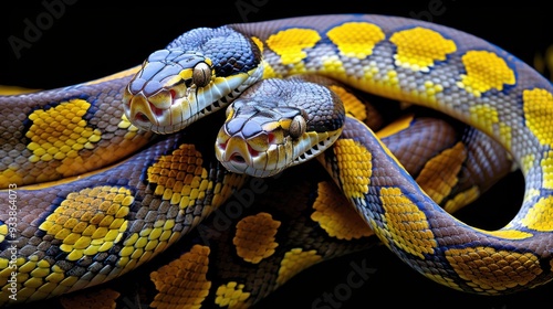 © Iswanto, Obraz premium Two yellow and blue snakes intertwining.