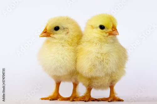 Fototapeta premium Two yellow chicks are standing on a white background full-length