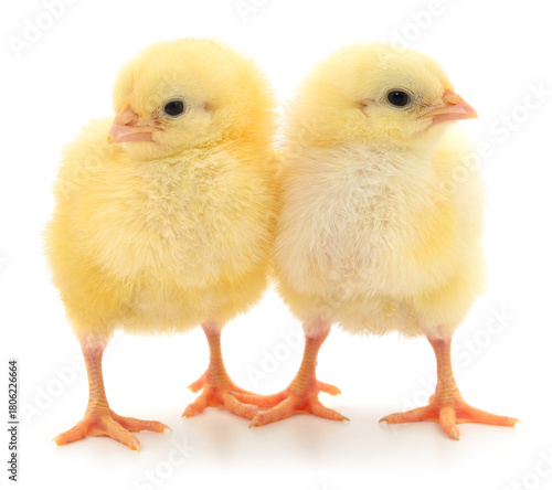 Obraz premium Two yellow chicks isolated on white background