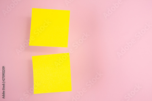 © droidfoto, Fototapeta premium Two yellow paper stickers hanging in the air (levitate) on a pink background