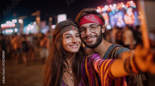 Fototapeta premium Two young adults smiling and posing for a selfie at a vibrant festival,...