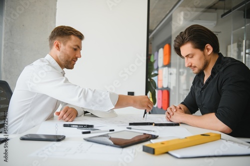© Serhii, Obraz premium Two young architects with blueprints of a house standing in office, talking.