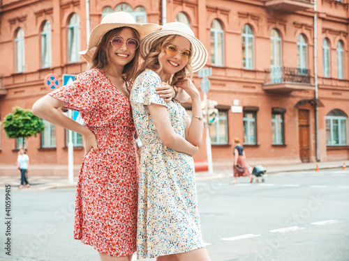 Naklejka premium Two young beautiful smiling hipster female in trendy summer sundress.Sexy carefree women posing on the street background in hats. Positive models having fun and hugging
