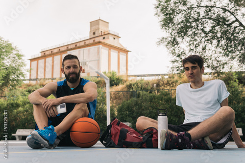 Fototapeta premium Two young boys sitting resting after a street basketball practice holding a...
