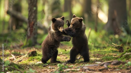 © Berkah, Fototapeta premium Two young brown bear cub in the fores.