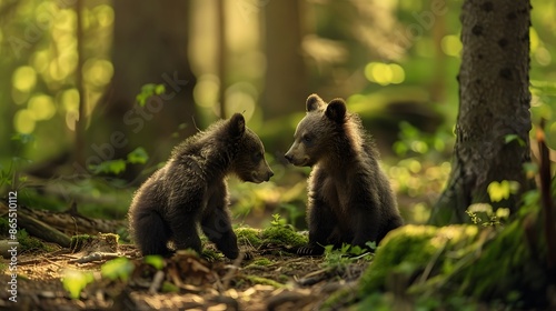 © Berkah, Fototapeta premium Two young brown bear cub in the fores.