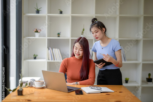 © Wasana, Obraz premium Two Young businesswomen talk, consult, discuss working with new startup project idea.