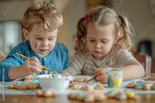 Fototapeta premium Two young children focused on painting cookies with edible color