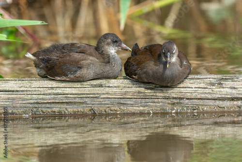 © bios48, Fototapeta premium Two young common moorhen (Gallinula chloropus) resting on a tree trunk in a river.