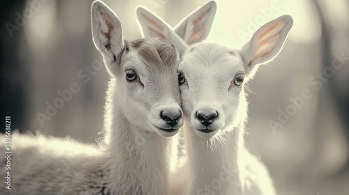 Fototapeta premium Two Young Deer Close Up Portrait Soft Warm Light Description Two