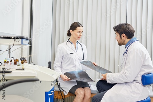 Obraz premium Two young doctors sitting and discussing x-ray at office