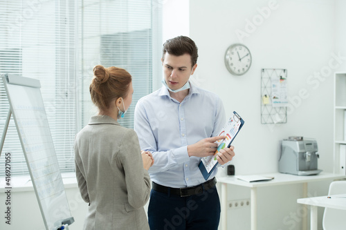 © pressmaster, Obraz premium Two young elegant accountants discussing financial data at meeting in office