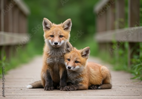 © Alper AI, Naklejka premium Two young fox kits sitting on a wooden path, one sitting up with a curious expression and the other lying down with its head resting on the first kit's back.