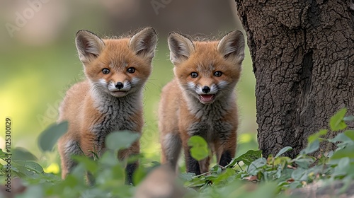 © Albert, Obraz premium Two young foxes standing next to a tree in the woods