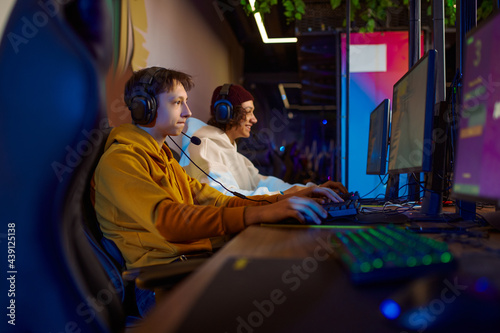 © Nomad_Soul, Obraz premium Two young gamers in headsets play in video game club