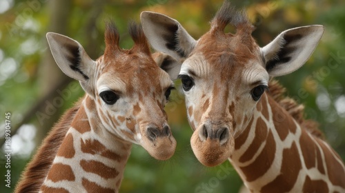 © mila103, Obraz premium Two young giraffes with spotted coats in a natural habitat.