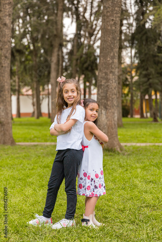 © Erik González, Fototapeta premium Two young girls are standing in a grassy field