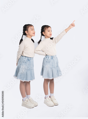 Naklejka premium Two young girls dressed alike, one pointing upwards, with similar outfits, on...