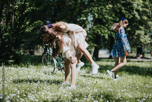 Obraz premium Two young girls enjoying a playful moment on a sunny day in a flower-filled park, portraying friendship and happiness.