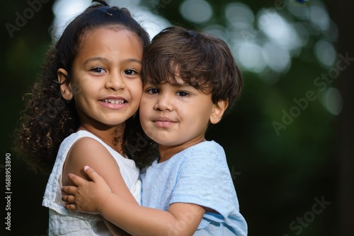 © Frame Vista, Fototapeta premium Two Young Girls Hugging Outdoors - Portrait of Childhood Friendship