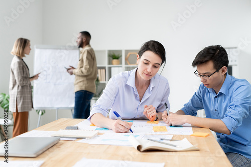 Obraz premium Two young intercultural brokers sitting by table in office and analyzing data