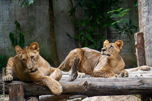 © Panthat Sitdatvirade, Naklejka premium Two young Lion cubs around 6-month-old cub playing together.