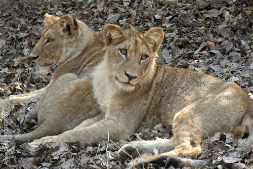 Naklejka premium Two young lions lying in Lower Zambezi National Park, Zambia