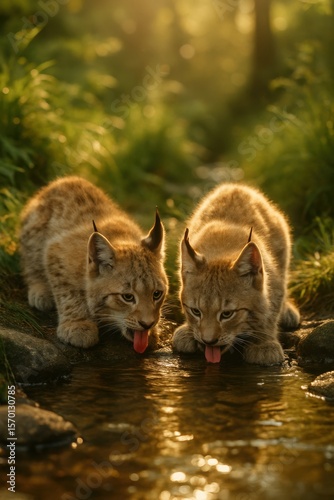 © Ulyana, Obraz premium Two young lynx kittens drinking water in forest stream at sunset