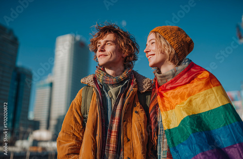 © aboutnuylove, Fototapeta premium Two young men looking at each other with a rainbow flag in the city