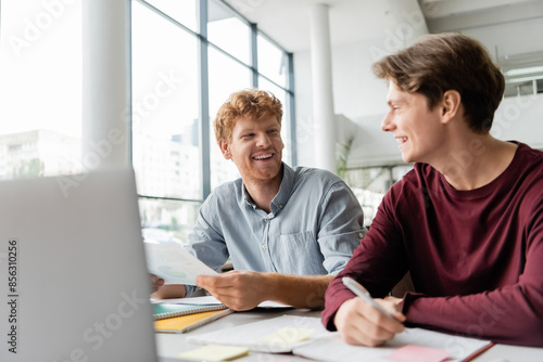 © LIGHTFIELD STUDIOS, Obraz premium Two young men sitting at a table, focused on studying together using a laptop.