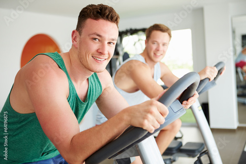 Obraz premium Two Young Men Training In Gym On Cycling Machines Together