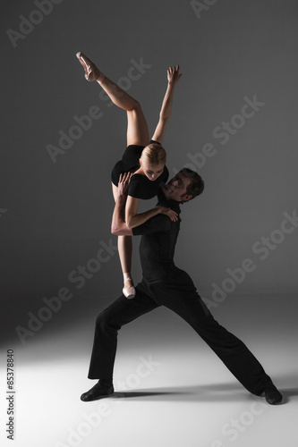 © master1305, Naklejka premium two young modern ballet dancers on gray studio background