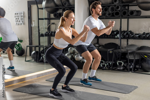 Fototapeta premium Two young people exercising in the gym in squatting position