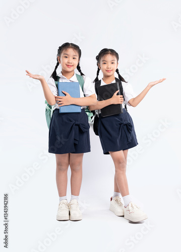 © Q88, Naklejka premium Two young schoolgirls in uniform with books and backpacks present towards the camera on a white background