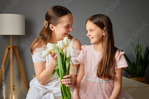 © sementsova321, Obraz premium Two young sisters share a warm moment in a bright living room. One sister holds a bouquet of tulips while they exchange smiles and laughter, creating a cheerful atmosphere