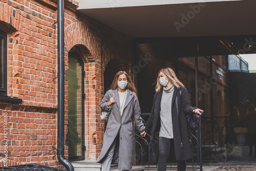 © satura_, Naklejka premium Two young stylish women in medical masks talking and laughing while walking the street in town. Friends strolling outdoor in city