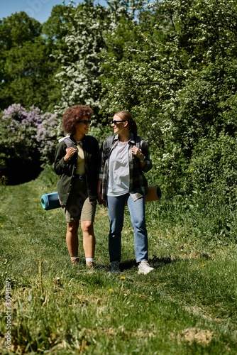 Fototapeta premium Two young women, a lesbian couple, hike together in a lush green forest on a sunny day.