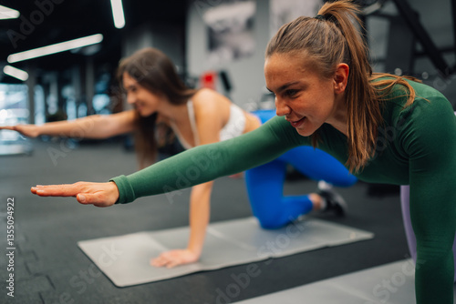 Obraz premium Two young women doing bird dog exercise in gym
