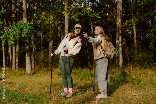 © m-art, Obraz premium Two young women enjoy a lively hike through a forested area. They discuss the scenery while using trekking poles, surrounded by lush greenery on a beautiful day.